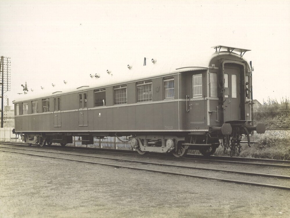 De foto toont de buitenzijde van postrijtuig 70221, dat als rijdend postkantoor werd ingezet op de lijn Brussel - Kortrijk in de jaren 1930. In dit rijtuig gebeurde de voorsortering van de post tijdens het vervoer. Het was speciaal voor dit doel ingericht. Het rijtuig werd vervaardigd door La Brugeoise et Nicaise & Delcuve. Schenking van Daniel Moyaerts.