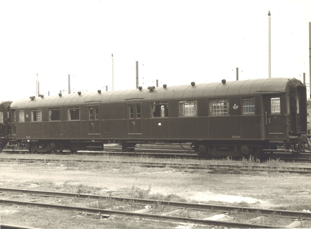 De foto toont de buitenzijde van postrijtuig 70.014. In dit rijtuig gebeurde de voorsortering van de post tijdens het vervoer. Het was speciaal voor dit doel ingericht, met postvakjes langs de zijwanden en de kopwand. Op de zijwand staan het rijtuignummer en twee keer de afbeelding van een posthoorn. Dit rijtuig werd gebouwd in 1931. Schenking van Daniel Moyaerts.