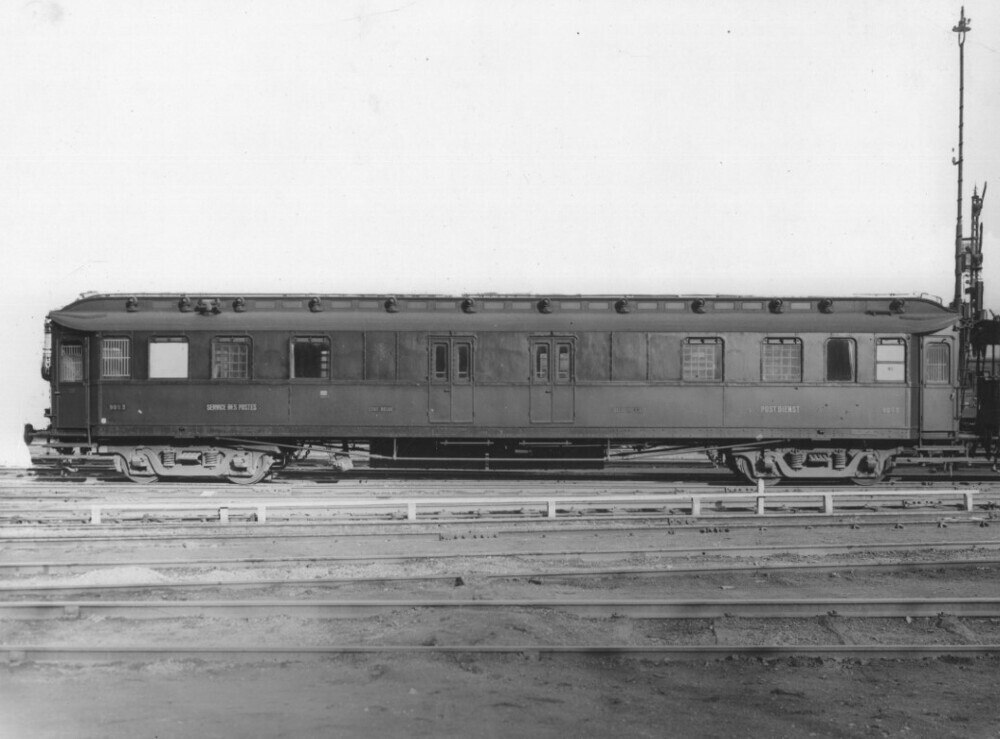 De foto toont de buitenzijde van postrijtuig 9053. In dit rijtuig gebeurde de voorsortering van de post tijdens het vervoer. Het was speciaal voor dit doel ingericht, met postvakjes langs de zijwanden en de kopwand. Op de zijwand staan het rijtuignummer, 'Service des postes', 'Etat belge', 'Belgische Staat', 'Postdienst' en het embleem van de Belgische Staatsspoorwegen. Schenking van Daniel Moyaerts.