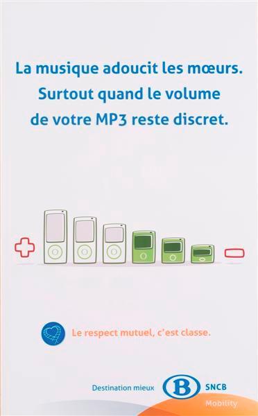 Deze witte affiche wil de reiziger aanmanen zich hoffelijk te gedragen in de trein. Op de affiche staan zes kleiner wordende MP3- toestellen op een rij. Ze doen denken aan een volumeaanduiding. Aan het begin van de rij staat een rode plus, op het einde van de rij staat een rode min. De drie kleinste MP3-toestellen zijn groen ingekleurd. Links zien we een blauwe cirkel met een spoorlijn in de vorm van een hart. Onderaan rechts staat 'Destination mieux' en het logo van NMBS Mobility.