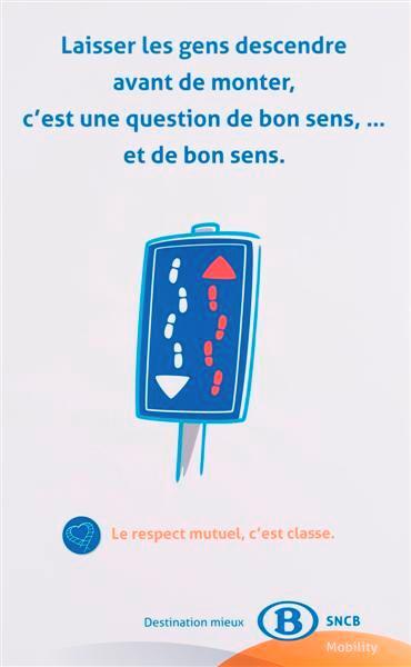 Cette affiche blanche veut inciter le voyageur à se comporter de manière courtoise lors de l'embarquement dans le train. Au centre de l'affiche se trouve un rectangle bleu avec deux flèches. La flèche rouge est tournée vers le haut, la blanche vers le bas. La ligne des deux flèches est composée de traces de pas. En dessous figure « Destination mieux », le logo de la SNCB, « SNCB » et « Mobility »