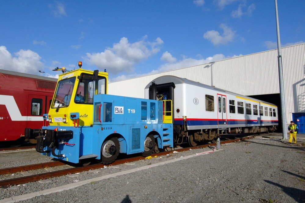 Groep van 31 digitale foto's. Ze tonen buitenzichten van het Technisch Onderhoudspost (TOP) in Schaarbeek. We zien een rangeerlocomotief en panoramische uitzichten op het gebouw en de sporen. Op de sporenbundel voor de loods staan M 4- en M 5-rijtuigen opgesteld. De M 4-rijtuigen zijn grijs, rood en kobaltblauw geschilderd. De M 5-rijtuigen hebben een bordeaux kleurstelling met een brede witte band.