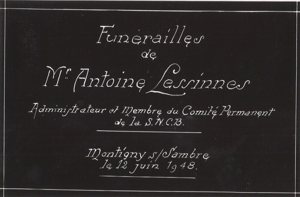 Het album bestaat uit 26 foto's, gebundeld in een kartonnen/kunstleer kaft. De eerste foto toont de tekst: 'Funérailles de Mr Antoine Lessinnes Administrateur et membre du Comité Permanent de la S.N.C.B. Montigny s/Sambre le 12 juin 1948. Dan volgen foto's van het gebouw van het 'Bestuur der Staatsspoorwegen' in Brussel, de rouwenden, lijkredes aan de doodskist, een detail van zijn medailles, de uitgebreide rouwstoet en de begrafenis op het kerkhof. De laatste foto toont de tekst: 'Service de Presse et Documentation de la S.N.C.B. Reportage photographique par Vits.'