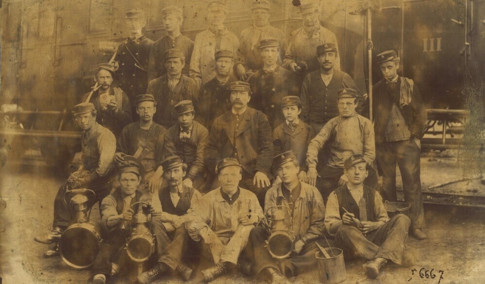 Voor de groepsfoto poseren 21 arbeiders en hun opzichter voor een houten rijtuig derde klas. De mannen hebben verschillende gereedschappen en lantaarns bij waarmee ze hun beroep uitbeelden. Onder de foto staat geschreven: 'Brigade des nettoyeurs de voitures et Lampistes De Bruxelles Quartier Léopold en 1880 (Brigadier Van Riet P.J. au milieu de la brigade)'. Schenking van Mr. Van Riet, oud hoofd-schoonmakers van Brussel-Noord.