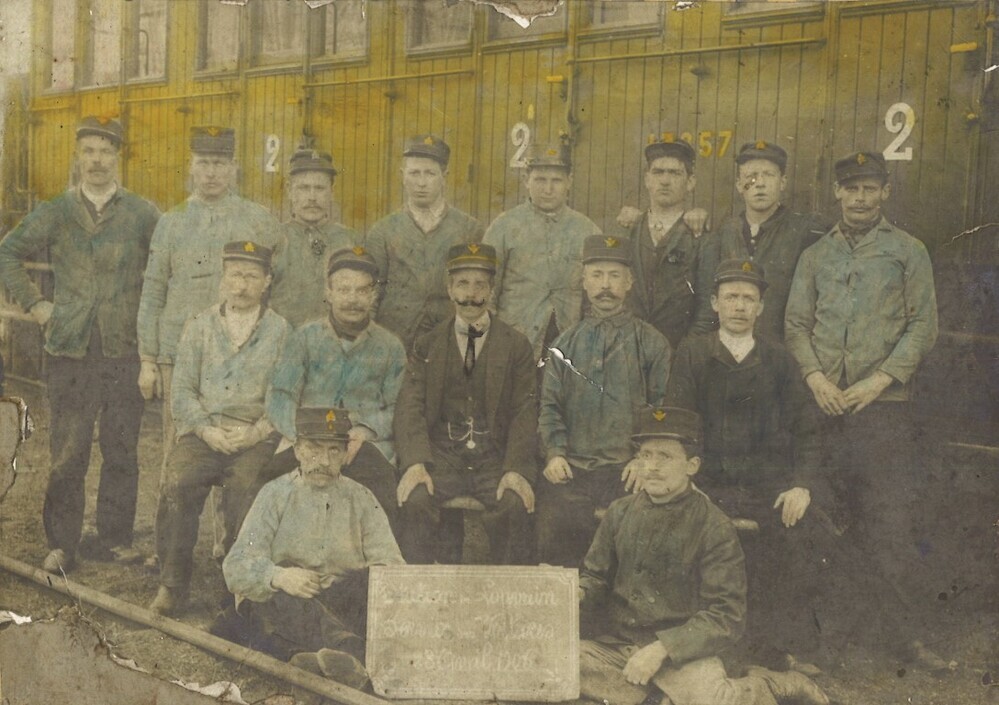 Voor de groepsfoto poseren 14 arbeiders en hun opzichter voor een houten GCI- rijtuig tweede klas. De twee mannen vooraan houden een bord vast waarop staat: 'Station Louvain [...] Voitures 28 Avril 1906'. Onder de foto staat geschreven: 'Brigade des nettoyeurs de voitures, station de Louvain le 28 avril 1906 Chef-nettoyeur Van Riet'. De foto werd ingekleurd. Schenking van Mr. Van Riet, oud hoofd-schoonmakers van Brussel-Noord.