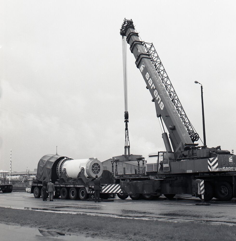 Deze fotogroep bevat negen negatieven. De foto's tonen de voorbereidingen voor het vervoer van radioactief afval. De opgewerkte staven uit de reactor van de kerncentrale worden verglaasd verpakt in een speciale container. Deze containers worden daarna geladen op een wagen en afgeschermd door een extra beschutting. Het vervoer gebeurde deels over de weg en deels met de trein naar een verwerkingsfirma. Op deze foto's zien we het laden van een container op een platte wagen met behulp van een zware kraan.