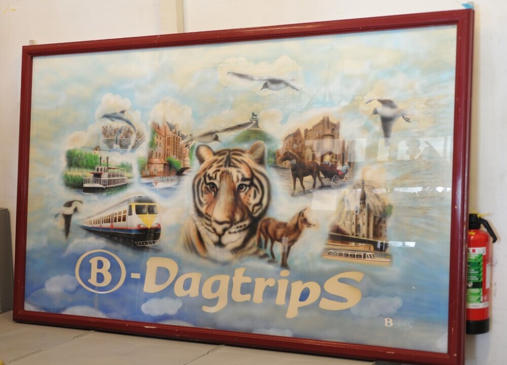 Deze schildering komt uit het station Aarschot. Het werd gemaakt om de reizigers warm te maken voor B-dagtrips. Centraal zien we een tijger en een wolf, daarond staan afbeeldingen van verschillende bezienswaardigheden in België, zoals het Gravensteen in Gent, een boottochtje op de Brugse reien, een boottocht in Dinant, etc. De achtergrond is een blauwe lucht met wolkjes en rondvliegende meeuwen. Links zien we een drieledig motortreinstel reeks 03 ‘Break’ in de kleuren lichtgrijs, donkergrijs, geel, kobaltblauw en rood.