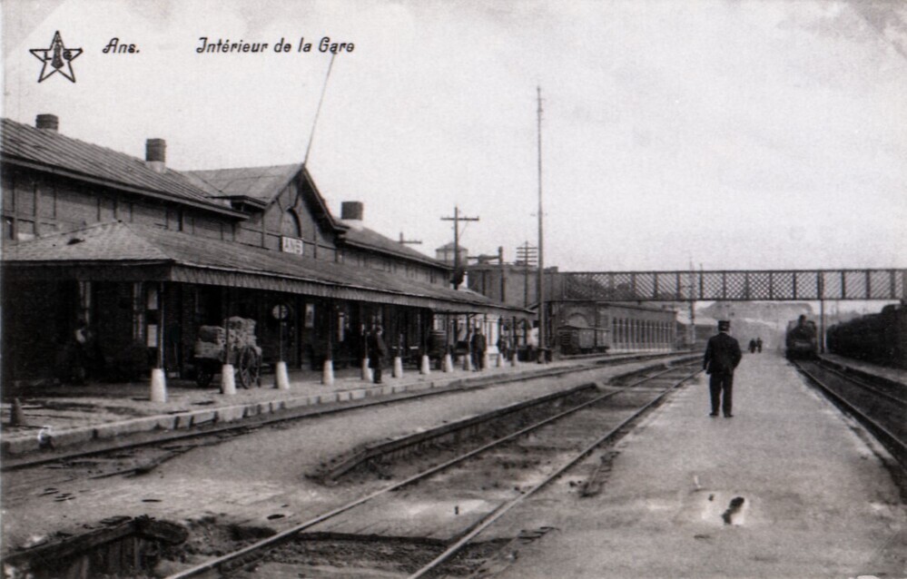 Reproductie van een postkaart met als opschrift 'Ans. Intérieur de la Gare'. Voor het opschrift staat het logo van de uitgever. De foto toont het station met luifel en naambord aan de kant van de sporen. Het gebouw heeft een schilddak met centraal een puntgevel. Het is met bakstenen opgetrokken tussen houten stijlen. Over het middenperron loopt een personeelslid. In de achtergrond zien we een voetgangersbrug en een stoomlocomotief.