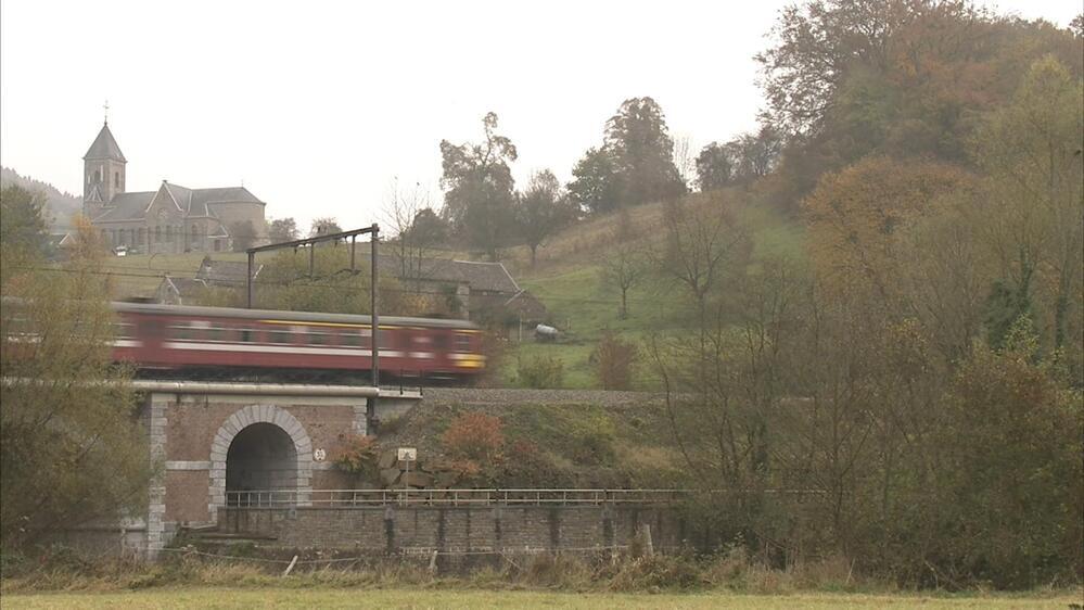 Een tweeledig motorstel rijdt op de spoorbrug over de Vesder op spoorlijn 37 in Goffontaine (Pepinster). Het motorstel is bordeaux geschilderd met brede witte en gele banden.