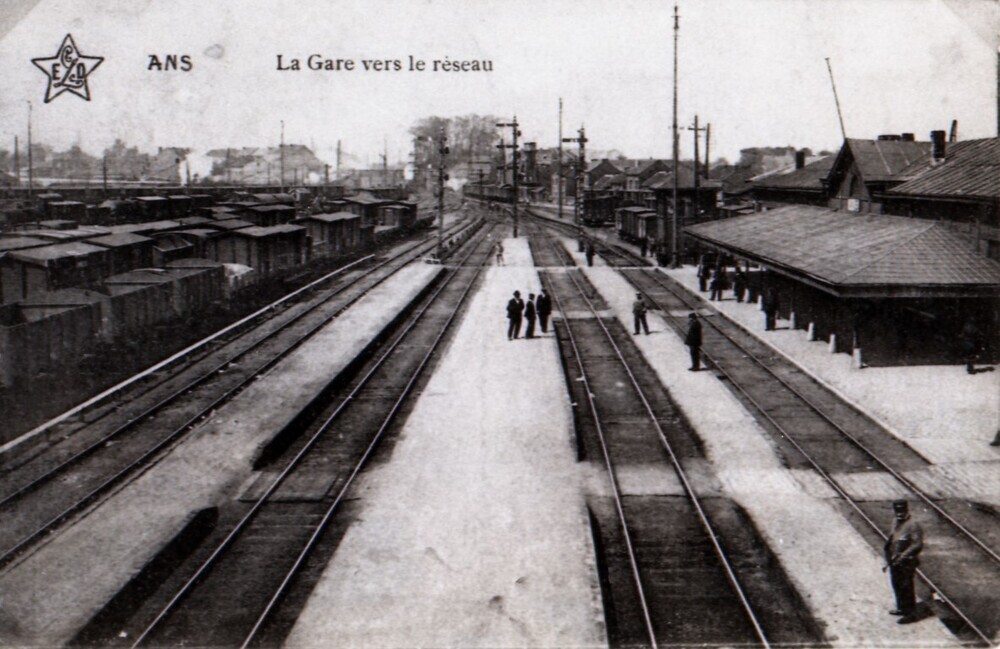 Reproductie van een postkaart met als opschrift 'Ans La Gare vers le réseau'. Voor het opschrift staat het logo van de uitgever. De foto toont het station met luifel aan de kant van de sporen. Het gebouw heeft een schilddak met centraal een puntgevel. Het is met bakstenen opgetrokken tussen houten stijlen. Op de perrons lopen personen heen en weer. Op de sporenbundel staan open en gesloten goederenwagens. In de achtergrond zien we mechanische seinen.