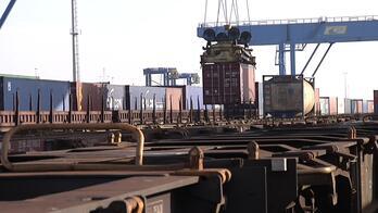 BeschrijvingMet een portaalkraan worden op de kade van een containerterminal in de haven van Antwerpen containers op platte wagens met rongen geplaatst.