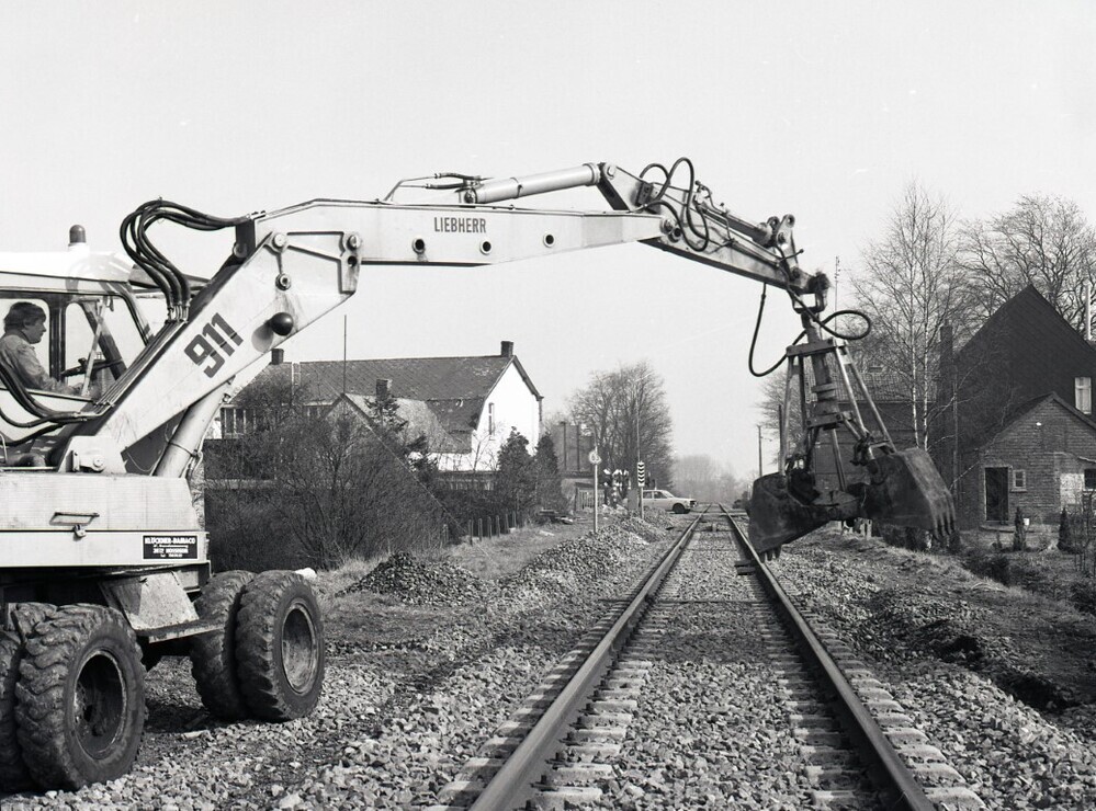 Deze fotogroep bevat twee negatieven. De foto's tonen een enkelsporig baanvak waarop werken worden uitgevoerd door middel van een kraan. Het type kraan op de foto laat toe om ballast te verplaatsen en wordt ook gebruikt voor de montage van de spoorstaven. Voor het uitvoeren van dergelijke werken is het betrokken gedeelte van de lijn buiten dienst gesteld. Op foto A ziet men iets verderop in de achtergrond een overweg waar een auto de spoorbaan oversteekt.