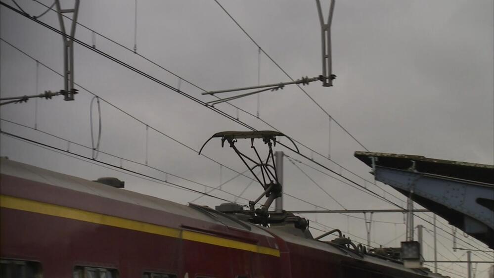 Een vierledig motorstel staat aan het perron van station Schaarbeek en vertrekt. Op een ander spoor rijdt een reizigerstrein samengesteld uit I 11-rijtuigen voorbij. We krijgen van beide treinen een close-up van de pantograaf die over de rijdraad glijdt.