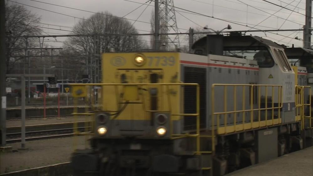 BeschrijvingIn station Schaarbeek rijden de gekoppelde diesellocomotieven 7739 en 7741 voorbij.