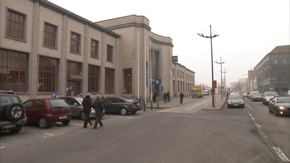 BeschrijvingEen bus van De Lijn rijdt langs de voorgevel van station Kortrijk.