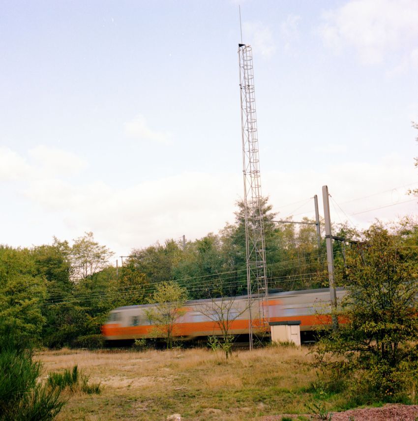 De foto toont een radiozendmast ter hoogte van de vertakking Linkebeek. Hij verzorgt het mobiele telefoonverkeer tussen de treindienstleiding en de treinbestuurder. Een vierledig treinstel reeks 800 rijdt voorbij. Het is grijs en oranje geschilderd.