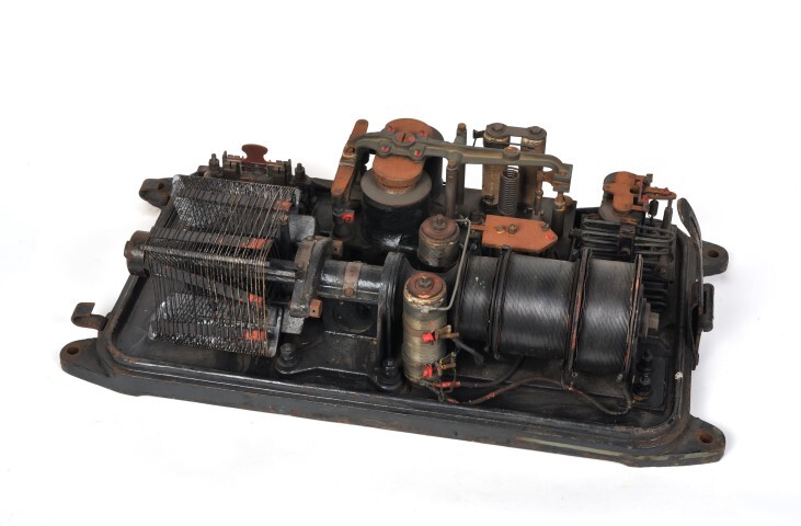 BeschrijvingDit is waarschijnlijk een stroomregulator die gebruikt werd om de batterij van een rijtuig op te laden, zodat men het kon verlichten. De regulator werd op een metalen plaat gemonteerd.