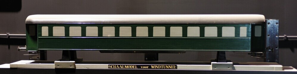 Dit groene schaalmodel werd in het begin van de jaren 1950 als test in de windtunnel gebruikt. Een windtunnel is een laboratoriumfaciliteit waarmee onderzoek gedaan kan worden naar de aerodynamische eigenschappen van een voorwerp. Door lucht onder gecontroleerde omstandigheden langs dit schaalmodel te laten stromen kon men het effect van de lucht op het rijtuig en omgekeerd bepalen. De resultaten van deze tests werden gebruikt om het ontwerp van het rijtuig zodanig aan te passen dat het zich optimaal zou gedragen tijdens het rijden onder verschillende weersomstandigheden.