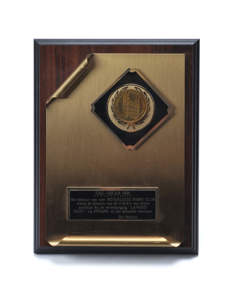 De trofee bestaat uit een houten plaat met daarop een metalen plaat met omgekrulde linkerbovenhoek en onderrand. Bovenaan hangt een medaille met een afbeelding van het stadhuis van Leuven en het opschrift 'Einde restauratie stadhuis 3 okt. 1982'. Onderaan hangt een zwart plaatje met opschrift: 'Ere-Oscar 1991 Het bestuur van vzw. Heverleese Hobby Club wenst de directie van de N.M.B.S. een dikker proficiat bij de recordpoging " Langste trein " op 27/04/91, en het behaalde resultaat. Het bestuur.'