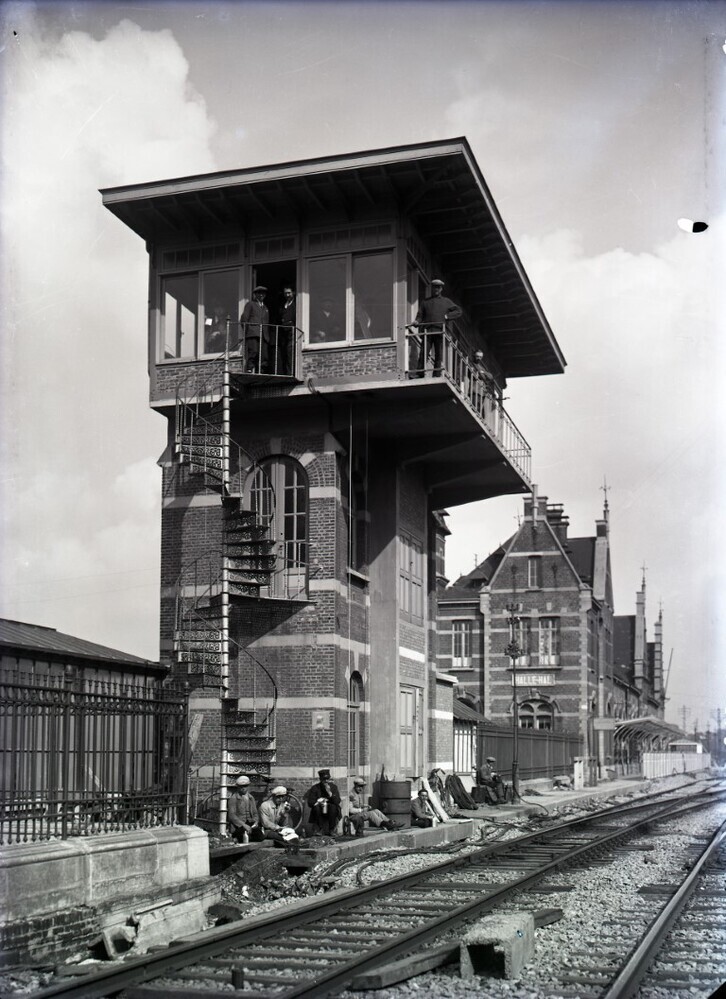 De fotogroep bestaat uit drie glasplaten. De foto's tonen de elektromechanische seinpost op een sokkel met buitenliggende draaitrap en balkon. In de achtergrond zien we het voormalige stationsgebouw in Vlaamse neorenaissancestijl met luifel en stationsnaambord. Een gietijzeren hek sluit het spoorwegdomein af. Op foto C poseren seingevers en spoorwegpersoneel voor de fotograaf.