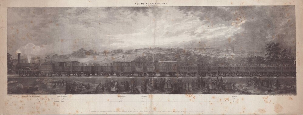Zwart-witafbeelding van een trein bestaande uit een stoomlocomotief, bankwagens, diligences en een berline. Op het voorplan staan veel mensen te kijken naar de voorbijrijdende trein. In de achtergrond zien we de stad Brussel liggen. Onder de afbeelding worden de prijzen voor de reizen Brussel - Antwerpen en Brussel - Gent vermeld per reisklas. Onderaan staat het opschrift: 'Locomotive ou Remorqueur trainant sur tous les Chemins de Fer par sa force trente et plus Berlines, Char-à-Bancs, Diligences et Wagons réunis, contenant 700 à 1000 personnes.'