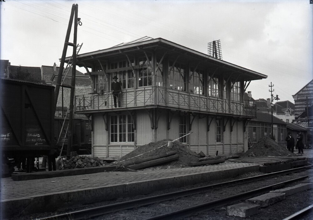De foto toont een mechanische seinpost opgetrokken uit hout en metalen onderdelen. Rondom de seinpost loopt een balkon onder een luifel. Op het perron en de seinpost zien we vermoedelijk spoorwegingenieurs. Het perron is met een paal met typische verlichtingsarmatuur uitgerust. Achter de seinpost staat een telefoon- en telegraafmast.