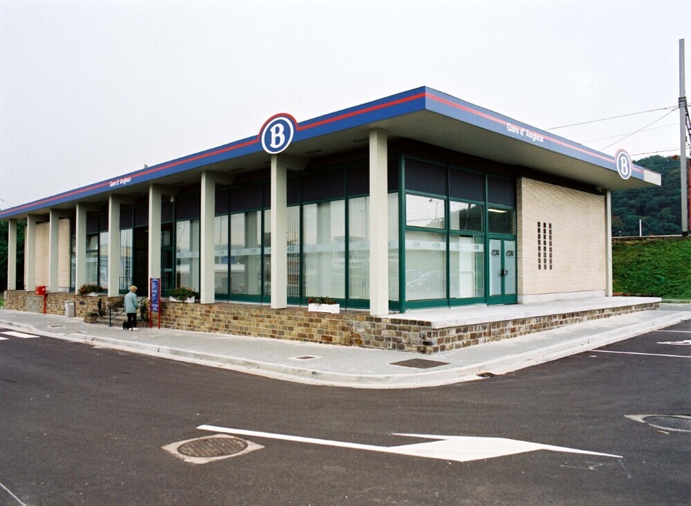 Deze fotogroep bevat 11 negatieven. Ze tonen het vernieuwde stationsgebouw aan de straatzijde. Dit gebouw heeft een uitspringende dakrand die steunt op kolommen. Op enkele foto's zien we ook de parking naast het station en de onderdoorgang naar de perrons.