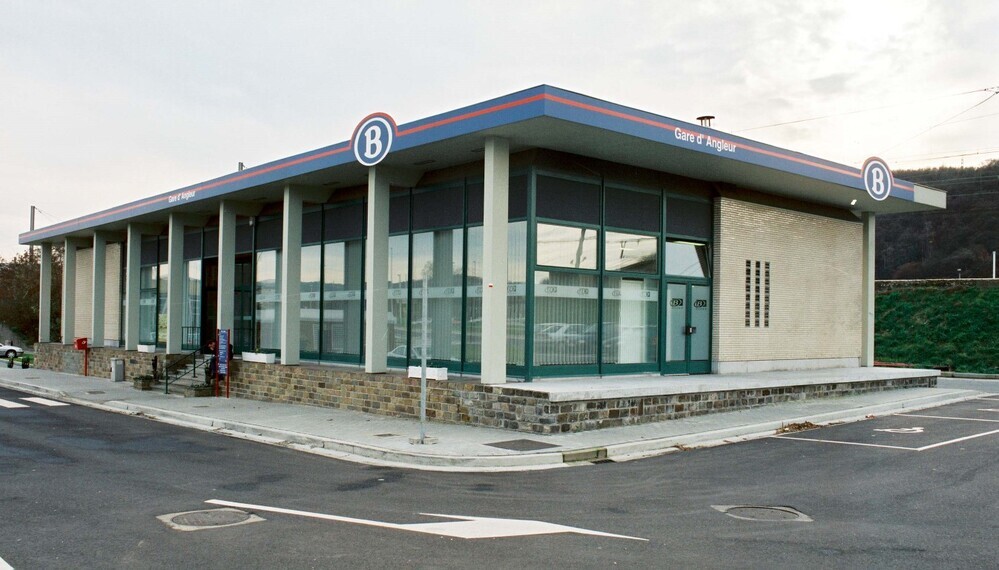 Deze fotogroep bevat 11 negatieven. Ze tonen het vernieuwde stationsgebouw aan de straatzijde met autoparking naast het gebouw. Dit moderne gebouw heeft een uitspringende dakrand die steunt op betonnen kolommen. Het werd ca. 1971 gebouwd ter vervanging van een ouder stationsgebouw dat iets verderop lag.