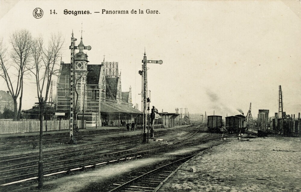 Reproductie van een postkaart met als opschrift '14. Soignies. - Panorama de la Gare.', voorafgegaan door het merk van de uitgever 'Phob'. De foto toont het de perrons, de goederenkoer en de achterzijde van het station. Op de voorgrond staan enkele mechanische seinen. In de goederenkoer staan enkele gesloten houten goederenwagens.
