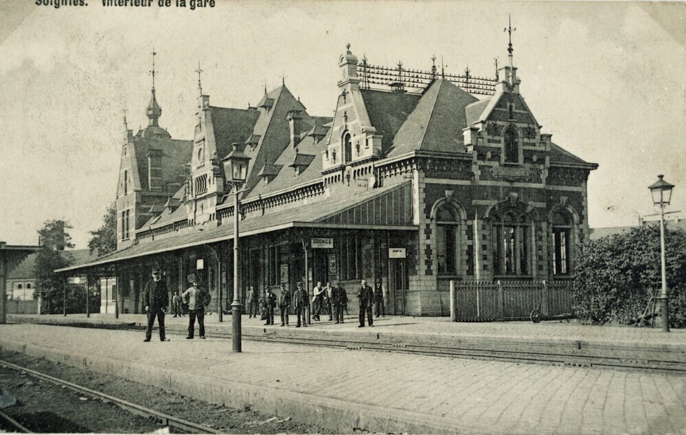 Reproductie van een postkaart met als opschrift 'Soignies. - Intérieur de la Gare.' De foto toont de achtergevel met luifel van het station. Personeelsleden poseren op beide perrons. Het station is opgetrokken in Vlaamse neorenaissancestijl met speklagen, zadeldak, puntgevels, torentjes en dakkapellen. Voor de verlichting worden petroleumlantaarns gebruikt. De dwarsliggers zijn met ballast bedekt om de stabiliteit van de sporen te verzekeren.