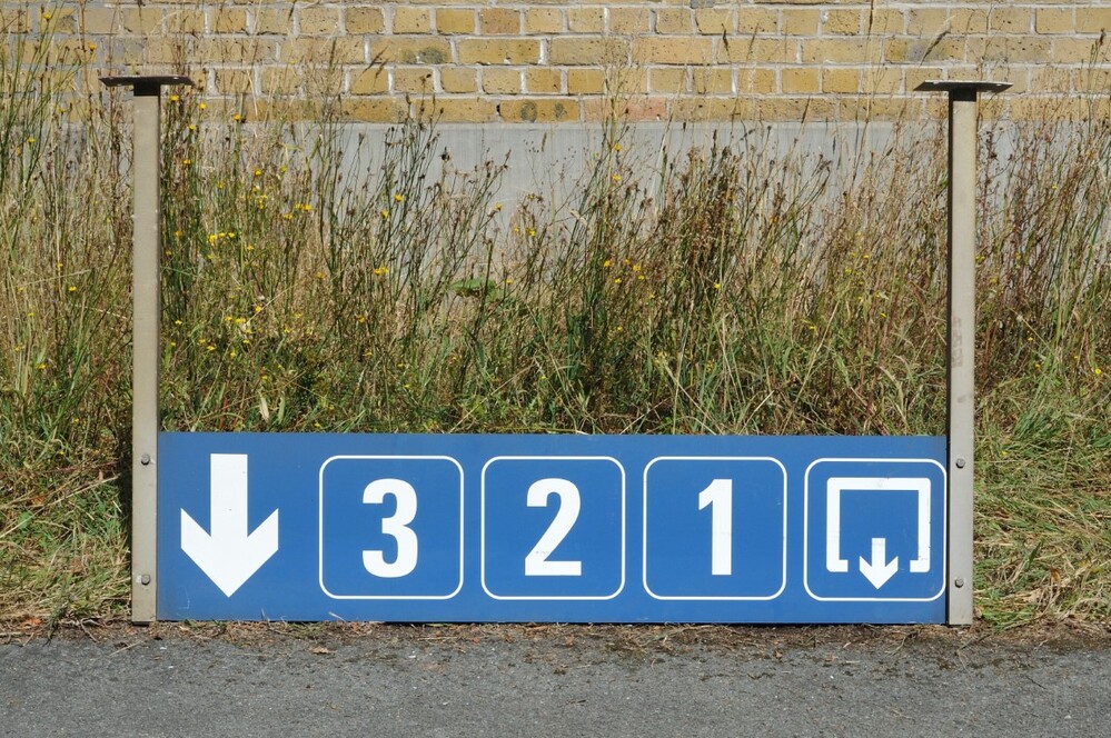 Blauw bord met op één zijde witte opschriften: van links naar rechts staat er een pijl naar onder, de cijfers 3, 2 en 1 die naar de sporen verwijzen en tenslotte een pictogram dat de uitgang aanduidt. Aan de zijkanten bevinden zich bevestigingen om het bord op te hangen aan een plafond, vermoedelijk in een onderdoorgang.