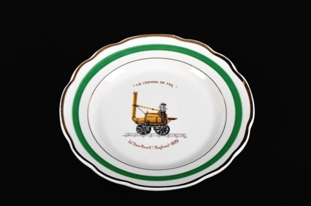 Wit bord met groene rand, twee gouden biezen en een afbeelding van de 'Sans-Pareil'. Naast de afbeelding bevinden er zich nog enkele opschriften: 'la "Sans-Pareil"- England- 1829 "Le chemin de fer" '. Dit bord maakte deel uit van een Frans servies met als thema bekende locomotieven. 'Sans-Pareil' was een Engelse stoomlocomotief, gebouwd in 1829.