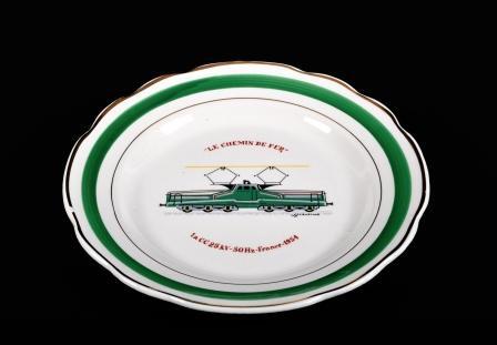 Wit bord met groene rand, 2 gouden biezen en een afbeelding van de CC 25 kV - 50 Hz. Naast de afbeelding bevinden er zich nog enkele opschriften: 'la CC kV - 50 Hz- France- 1954' en '"Le chemin de fer"'. Dit bord maakte deel uit van een Frans servies met als thema bekende locomotieven. De CC 25 kV - 50 Hz' was een Franse elektrische locomotief, gebouwd in 1954. 25 kV - 50 Hz staat voor een systeem van wisselspanning op het hoogspanningsnet. Dit systeem werd vanaf 1951 in Frankrijk gebruikt.