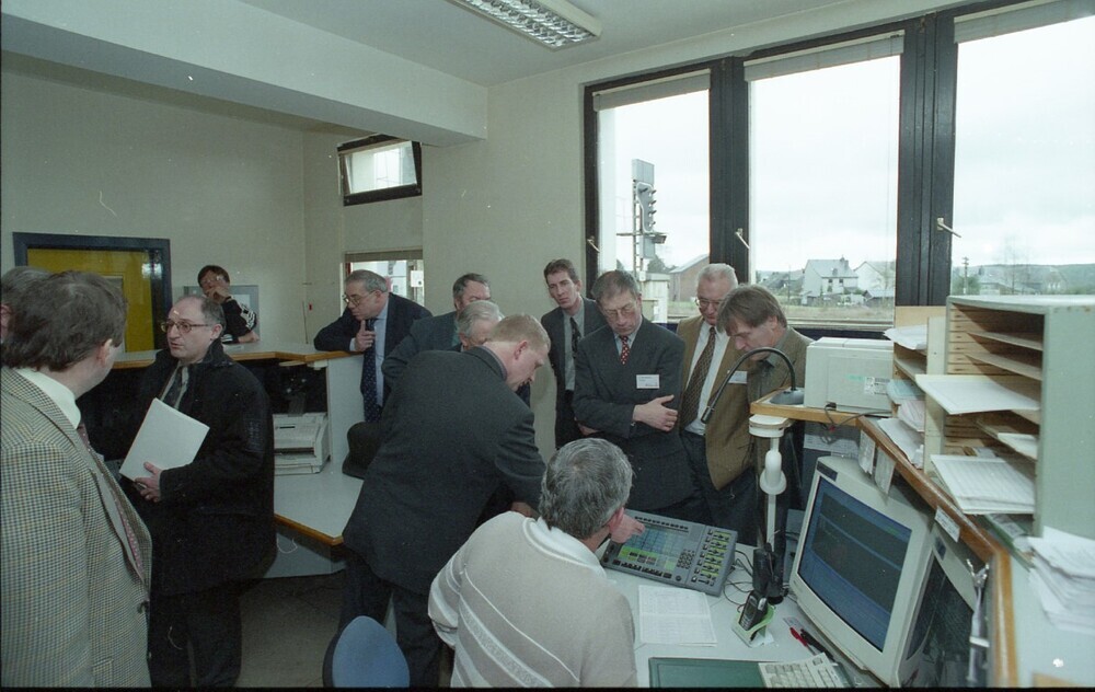Deze fotogroep bevat 65 negatieven. We zien directieleden bij hun bezoek aan de EBP -PLP (Elektronische Bediende Post / Poste à Logique Programmée) te Bertrix. Ze maken kennis met de personeelsleden in de seinpost waarna ze de technische installaties bezoeken. Voor hun werk beschikken de seingevers over beeldschermen, een modern toetsenbord en telefoon. Op een foto zien we de nieuwe apparatuur naast de vroegere telefooncentrale met tuimelschakelaars. Voor hun verplaatsing maken de directieleden gebruik van een rood/gele motorwagen reeks 44 of 45.