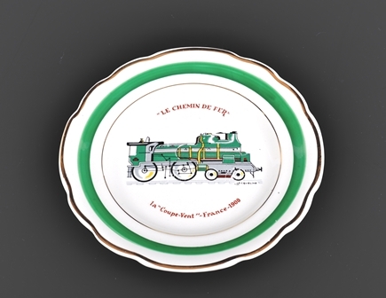 Klein wit bordje met groene rand, twee gouden biezen en een afbeelding van de 'Coupe-Vent'. Naast de afbeelding bevinden er zich nog enkele opschriften: 'la "Coupe-Vent"- France- 1900' en '"Le chemin de fer"'. Dit bordje maakte deel uit van een Frans servies met als thema bekende locomotieven. De Coupe-Vent was een Franse stoomlocomotief, gebouwd in 1900.