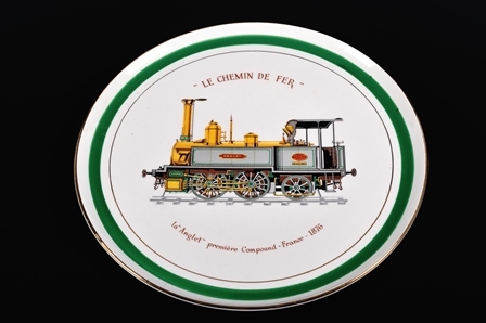Wit dienblad met groene rand, 2 gouden biezen en een afbeelding van de 'Anglet'. Naast de afbeelding bevinden er zich nog enkele opschriften: 'la "Anglet" - France- 1876' en '"Le chemin de fer"'. Dit dienblad maakte deel uit van een Frans servies met als thema bekende locomotieven. 'Anglet' was een Franse stoomlocomotief, gebouwd in 1876. Het was een compound- of dubbele expansie-locomotief, waarbij stoom eerst in een hogedrukcilinder en daarna in een lagedrukcilinder expandeerde: hiermee kon een groter rendement worden behaald.
