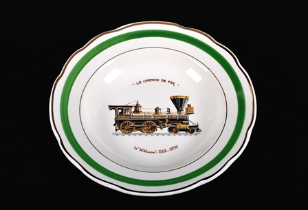 Wit bord met groene rand, twee gouden biezen en een afbeelding van de 'W.Mason'. Naast de afbeelding bevinden er zich nog enkele opschriften: 'la "W.Mason"- USA- 1856' en '"Le chemin de fer"'. Dit bord maakte deel uit van een Frans servies met als thema bekende locomotieven. 'W.Mason' was een Amerikaanse stoomlocomotief, gebouwd in 1856 voor de lijn Baltimore - Ohio. Ze werd vernoemd naar de constructeur, William Mason.