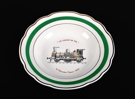 Wit bord met groene rand, twee gouden biezen en een afbeelding van de 'Schneider'. Naast de afbeelding bevinden er zich nog enkele opschriften: 'la "Schneider" - France- 1865 "Le chemin de fer" '. Dit bord maakte deel uit van een Frans servies met als thema bekende locomotieven. De 'Schneider' was een Franse stoomlocomotief, gebouwd in 1865.