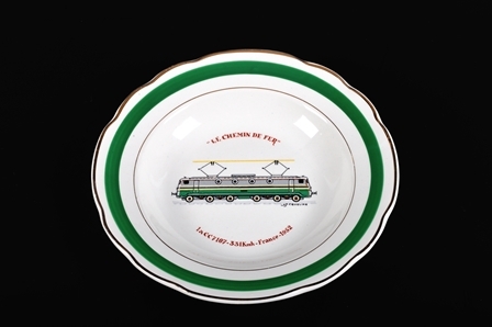 Wit bord met groene rand, 2 gouden biezen en een afbeelding van de CC 7107. Naast de afbeelding bevinden er zich nog enkele opschriften: 'la CC 7107 - 331 Kmh- France- 1952' en '"Le chemin de fer"'. Dit bord maakte deel uit van een Frans servies met als thema bekende locomotieven. De CC 7107 was een Franse elektrische locomotief, gebouwd in 1952. Op 28 maart 1955 werd zij beroemd toen ze het wereldsnelheidsrecord op rails vestigde met een snelheid van 331 km/u. Dit record staat op naam van twee locomotieven: de BB 9004 en de CC 7107, beide van de SNCF.