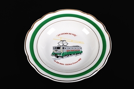 Wit bord met groene rand, 2 gouden biezen en een afbeelding van locomotief BB 9004. Naast de afbeelding bevinden er zich nog enkele opschriften: 'la BB 9004 - 331 Kmh- France- 1952' en '"Le chemin de fer"'. Dit bord maakte deel uit van een Frans servies met als thema bekende locomotieven. De BB 9004 was een Franse elektrische locomotief, gebouwd in 1952. Op 29 maart 1955 behaalde deze locomotief een snelheidsrecord van 331 Km/u. Dit record staat op naam van twee locomotieven: BB 9004 en CC 7107, beide van de SNCF.