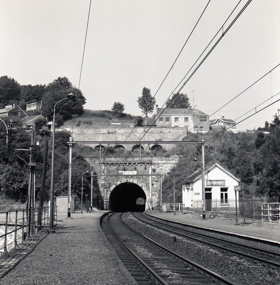 De foto toont de ingang van de tunnel van Fraipont. De tunnel is gelegen op het einde van de perrons van de stopplaats Fraipont, een deelgemeente van Trooz. Doorheen deze tunnel loopt de dubbelsporige lijn 37 tussen Luik en Verviers. De tunnel heeft een lengte van 262 meter. Rechts zien we het tweede en ondertussen verdwenen stationsgebouw van Fraipont met naambord. De perrons zijn met naamborden en elektrische verlichtingspalen uitgerust.