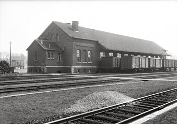 BeschrijvingDe foto toont de goederenloods met luifel. Voor de loods staan gesloten goederenwagens opgesteld.