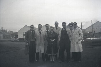 BeschrijvingDe foto toont het personeel van de medische dienst. Ze poseren voor de gebouwen van de werkplaats Leuven.