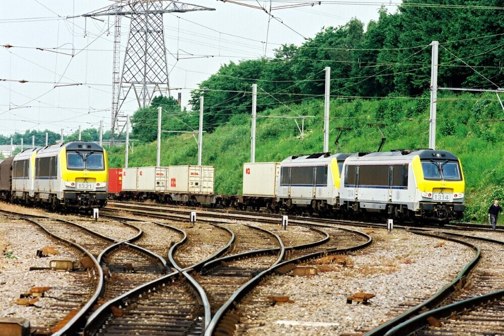 Deze fotogroep bevat vier negatieven. Dit zijn opnames van verschillende goederentreinen in de sporenbundel te Stockem. We zien o.a. elektrische locomotieven 1314 en 1310 in dubbeltractie met een containertrein en elektrische locomotief 1321 met een kalktrein.