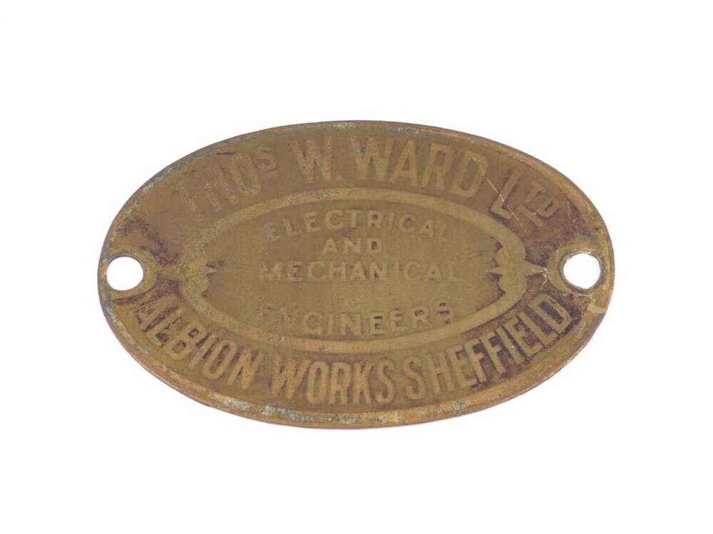 Dit metalen plaatje werd door de fabrikant ter identificatie aangebracht op het door hem vervaardigde materiaal. Op de plaat staat het opschrift 'Thos W. Ward Ltd Albion Works Sheffield Electrical and Mechanical Engineers'. De firma bouwde onder meer metalen onderstellen voor locomotieven en rijtuigen.