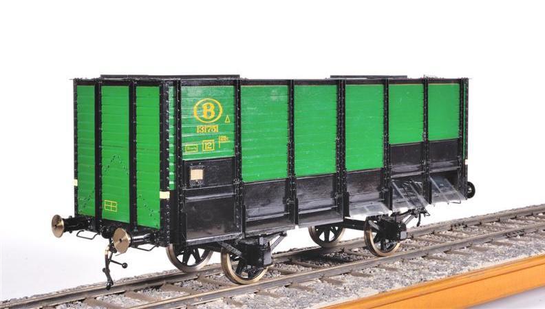 Deze tremelwagen van het type 1000B werd tussen 1918 en 1952 gebouwd. Hij werd gebruikt voor het vervoer van losse goederen zoals zand, kolen, enz. Dankzij de zijwaarts openschuifbare kleppen en de geprofileerde bodem (omgekeerde V-vorm), kon men de goederen snel lossen. De maquette is gemaakt op schaal 1/10.