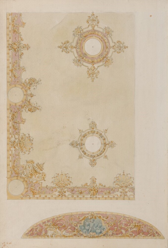 Deze ontwerptekening toont de decoratieve versiering van het plafond in de eetzaal van het rijtuig B1 van de trein 'Leopold II / Albert I'. De fries in deze eetzaal is geïnspireerd op een trein, met florale versieringen en maskers in roos en goud. De boogvormige schilderingen op de korte wanden hebben centraal een grisaille met engelen en rondom florale motieven. Rond de lampen werden rozetten met gestileerde bloemmotieven geschilderd. De uiteindelijke schilderingen in het rijtuig wijken licht af van deze ontwerptekening.