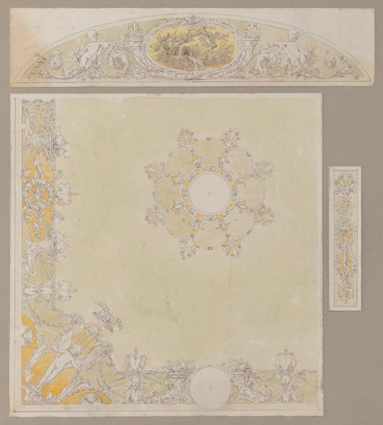 Deze ontwerptekeningen tonen de decoratieve versiering van het plafond in het salon van het rijtuig B1 van de trein 'Leopold II / Albert I'. De fries in dit salon bestaat uit florale versieringen, hoorns des overvloeds en engelen in groen en goud. De boogvormige schilderingen op de korte wanden hebben centraal een ovaal tafereel, geflankeerd door twee putti en florale motieven. Rond de lampen werden rozetten met gestileerde bloemmotieven geschilderd. De uiteindelijke schilderingen in het rijtuig wijken licht af van deze ontwerptekening. Dit geheel bestaat uit drie ontwerpen.