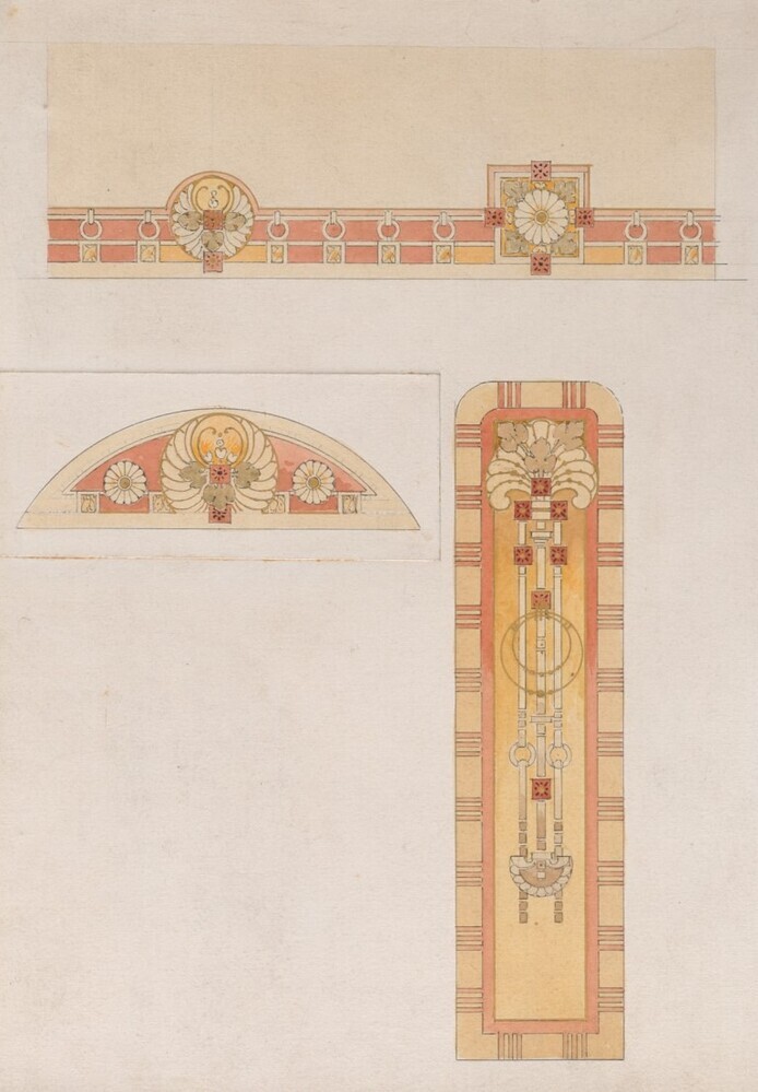 Deze ontwerptekening toont de decoratieve versiering van de gang in het rijtuig B1 van de trein 'Leopold II / Albert I'. De fries van het plafond en schilderingen op de tussenwanden tonen motieven in Art Nouveaustijl. De uiteindelijke schilderingen in het rijtuig wijken licht af van deze ontwerptekening.