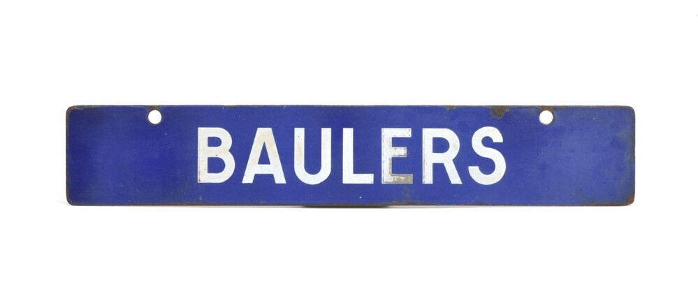 BeschrijvingBlauw bord met witte letters. Het bord werd aan een treinaankondiger gehangen om treinen richting Baulers aan te kondigen.